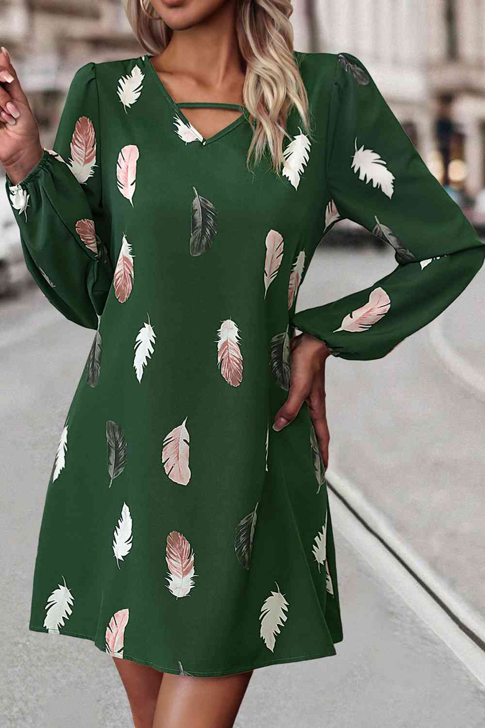 Feather Print V-Neck Dress