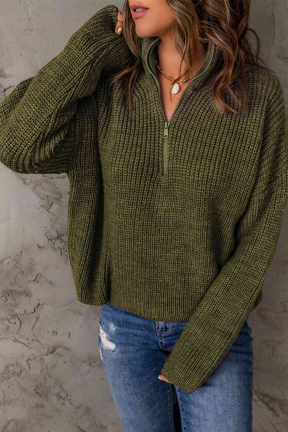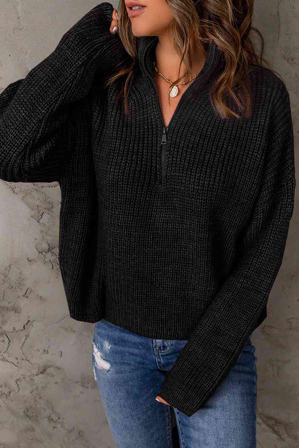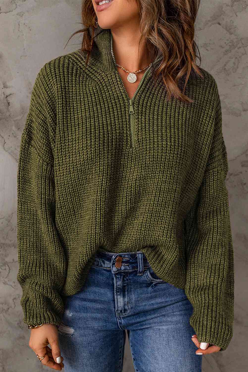 Woven Right Half Zip Rib-Knit Dropped Shoulder Sweater