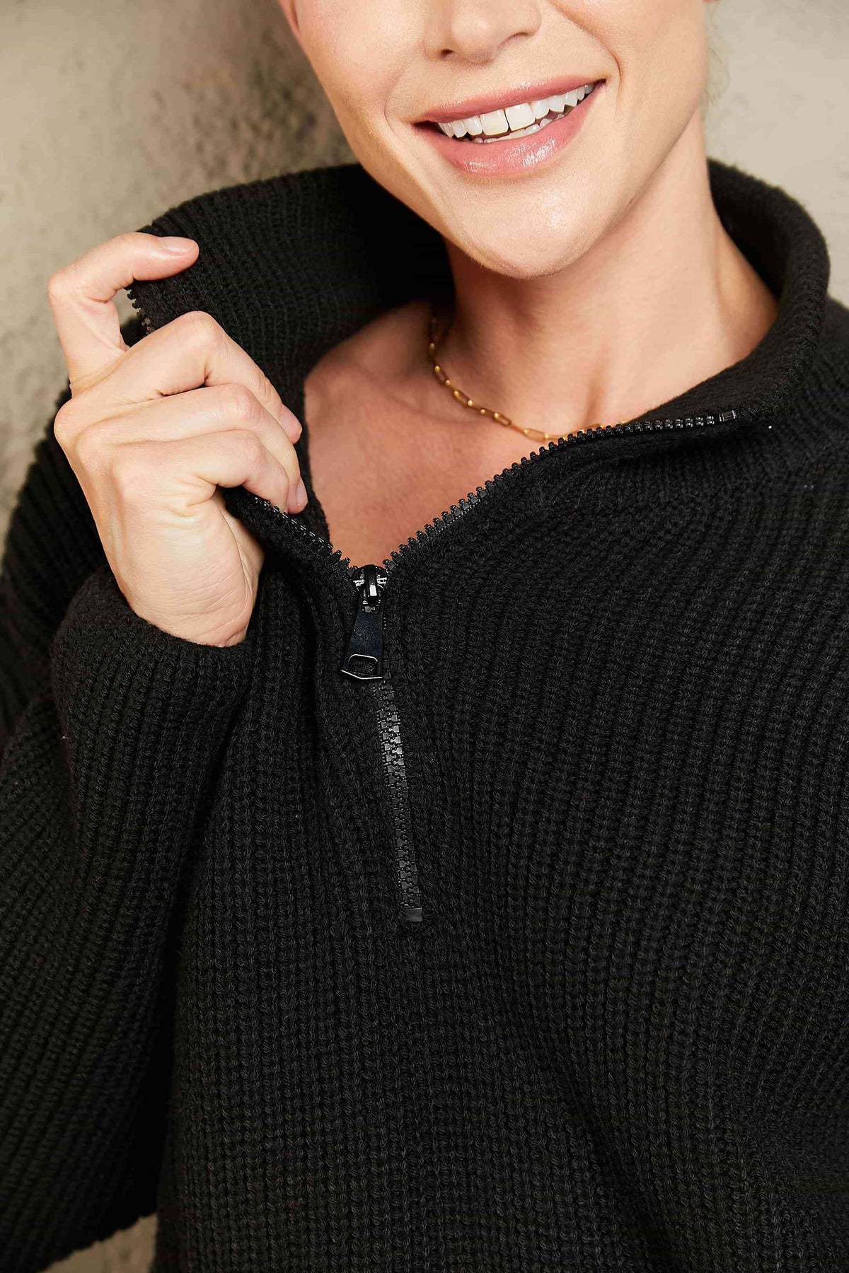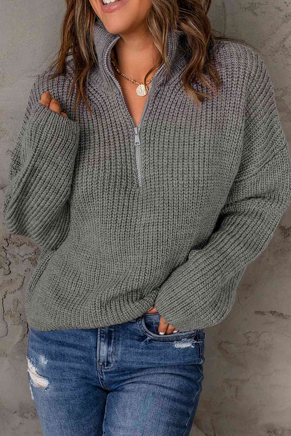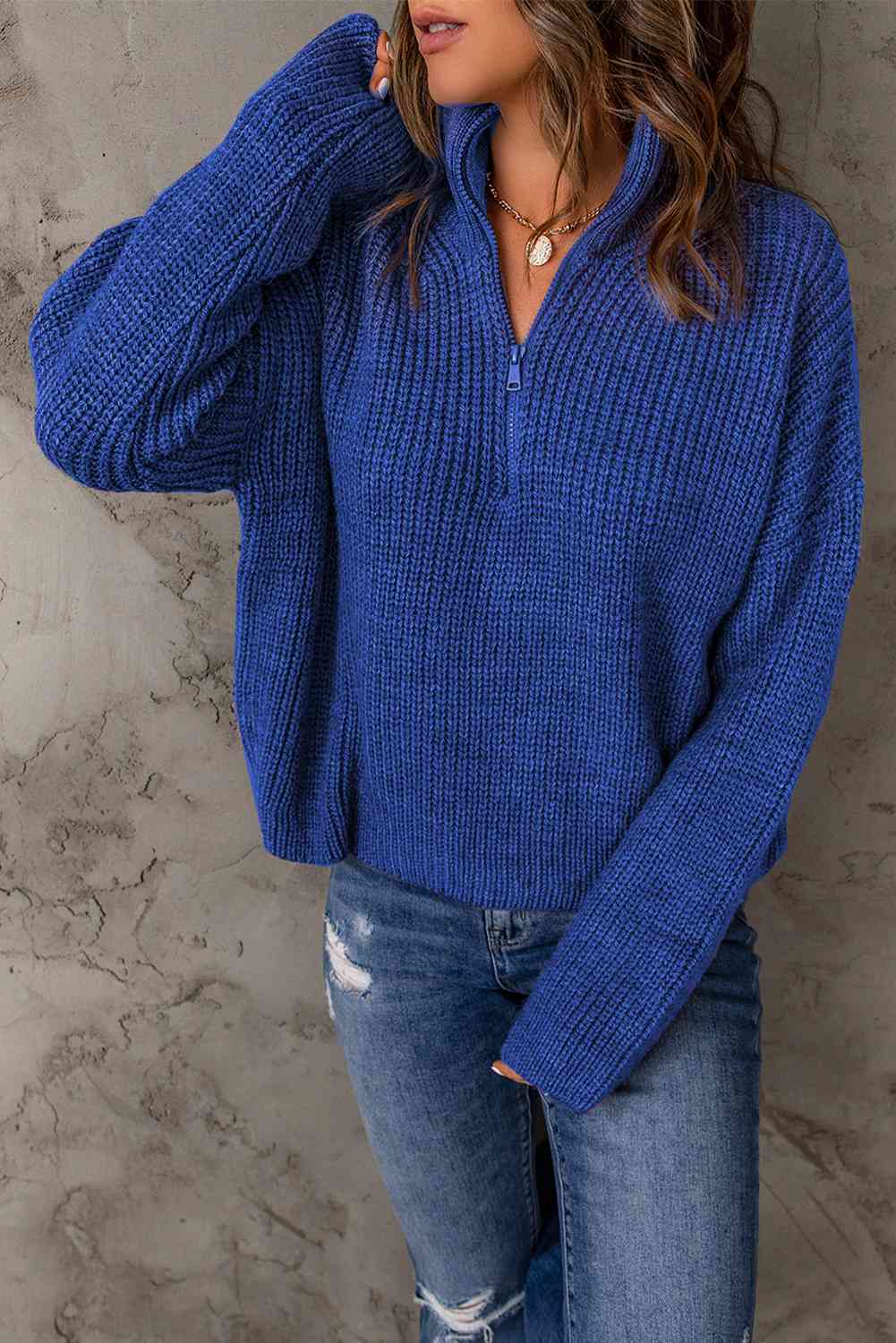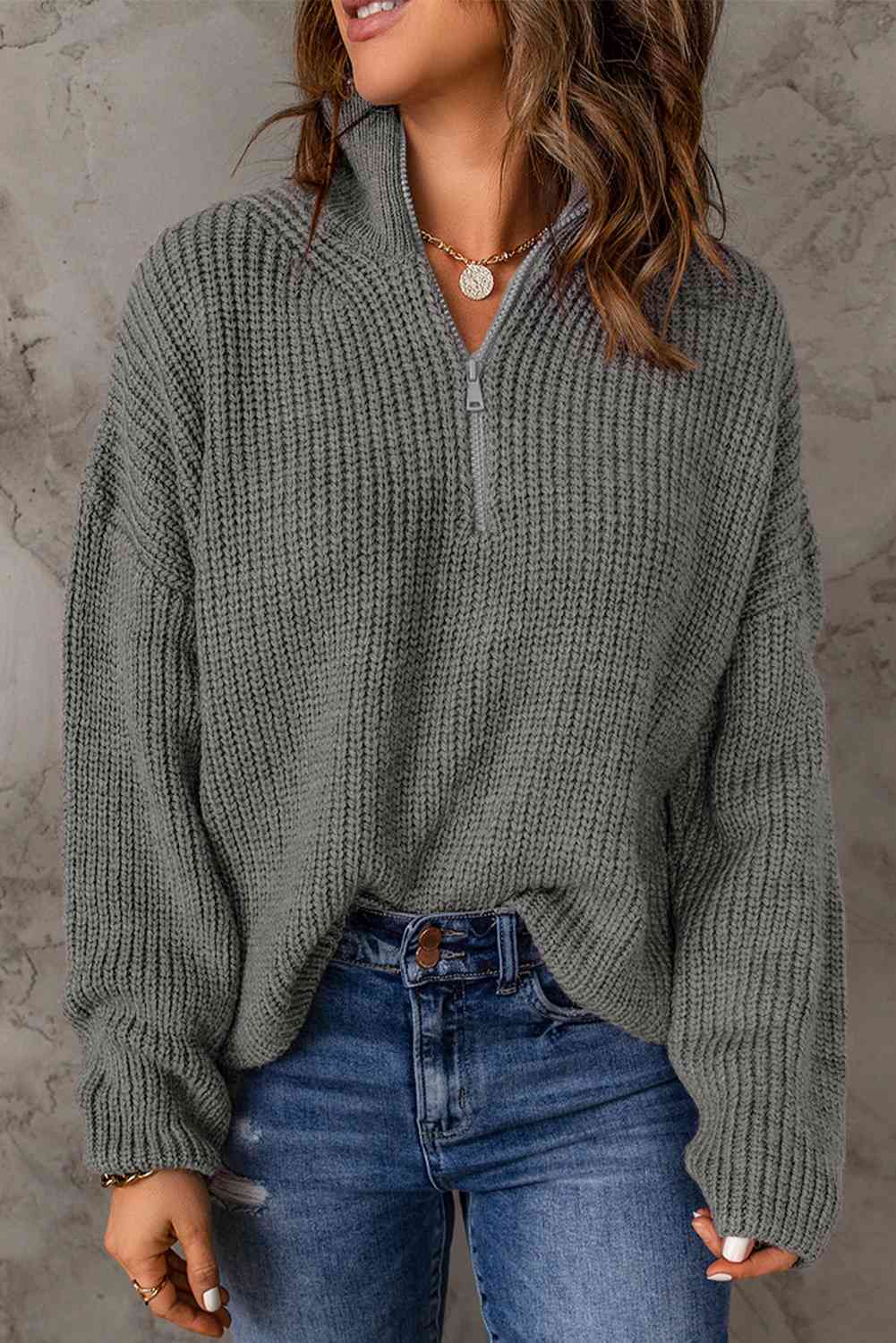 Woven Right Half Zip Rib-Knit Dropped Shoulder Sweater