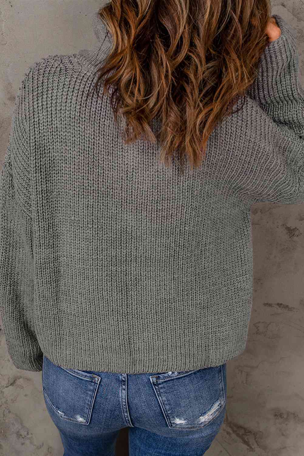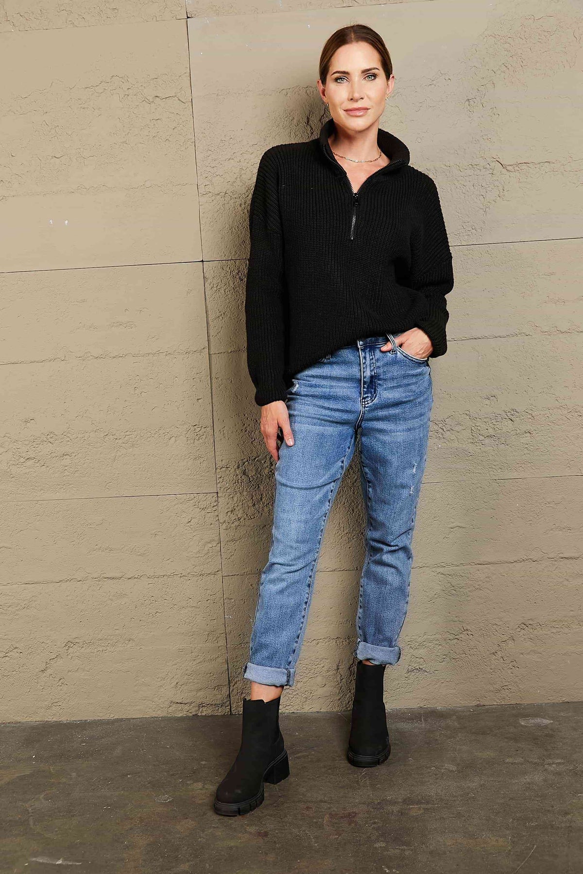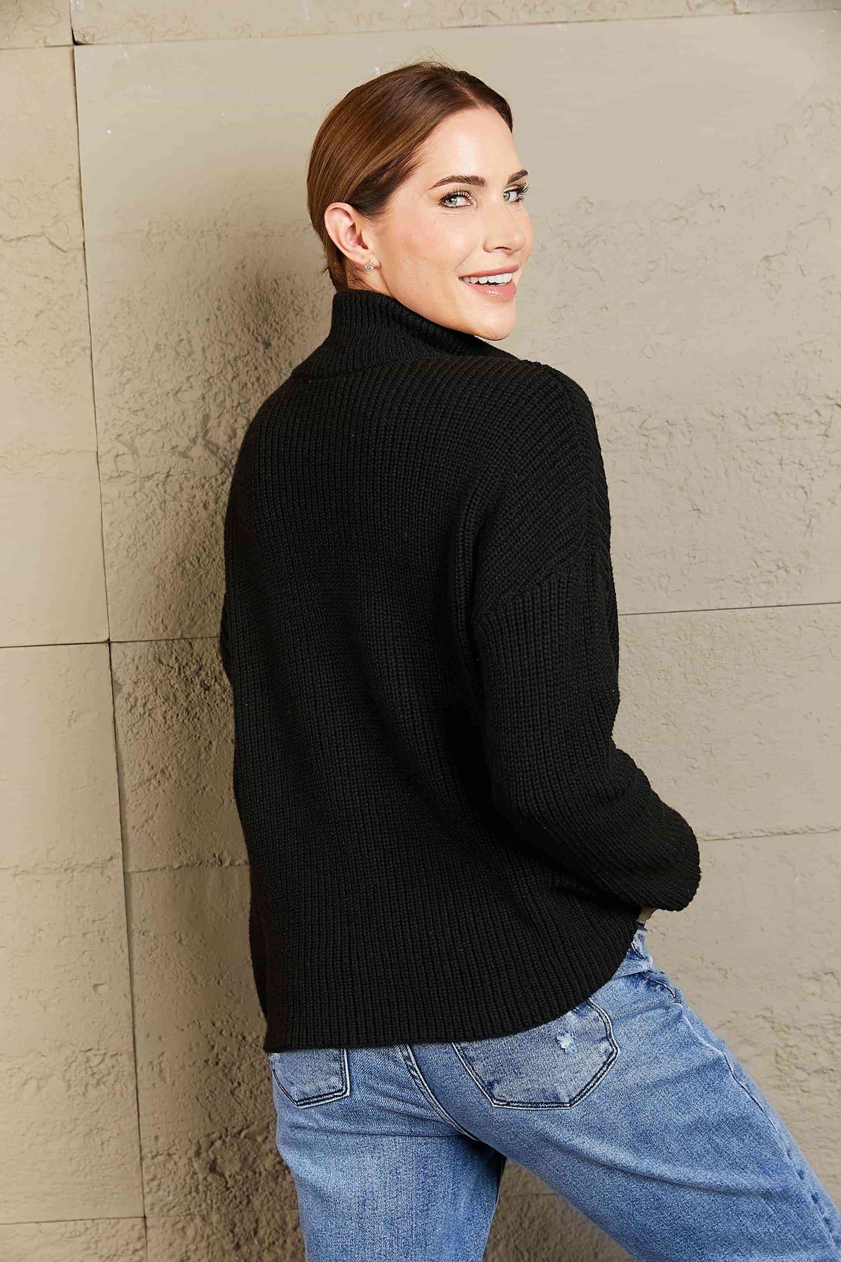 Both simple and elegant, this dropped shoulder sweater is perfect for the minimalist in any wardrobe. Featuring a classic high neck and zipper front, this top can be paired with any bottoms for a look that's sure to turn heads.